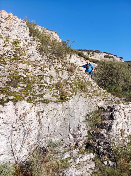 Una vez atravesada esta grieta, ascendemos por unos escalones labrados en la roca para acceder al balcón de los lirios, donde se sitúa, en un lugar privilegiado, el altar o santuario prehistórico.