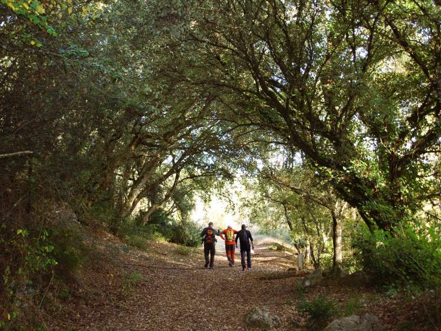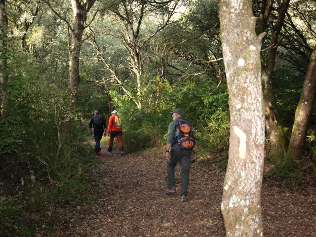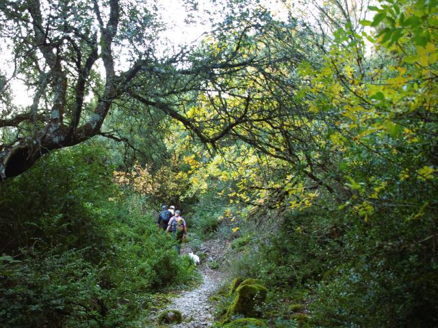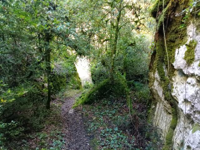 Nos internamos en el bosque y seguimos unas marcas amarillas que ascienden hacia las paredes de esta montaña.