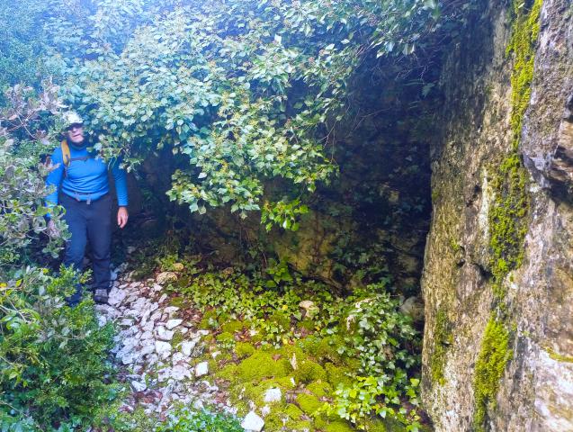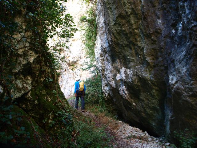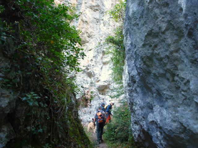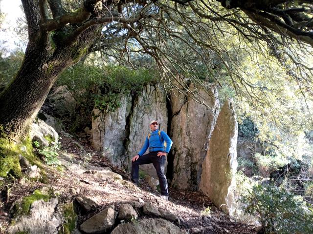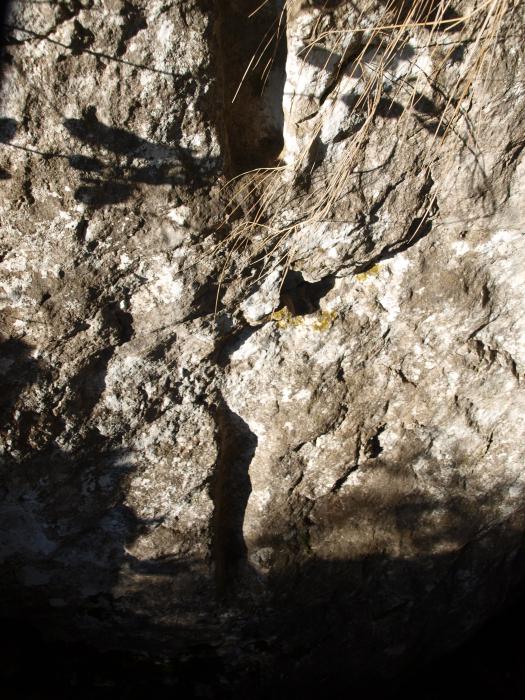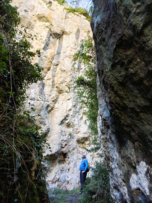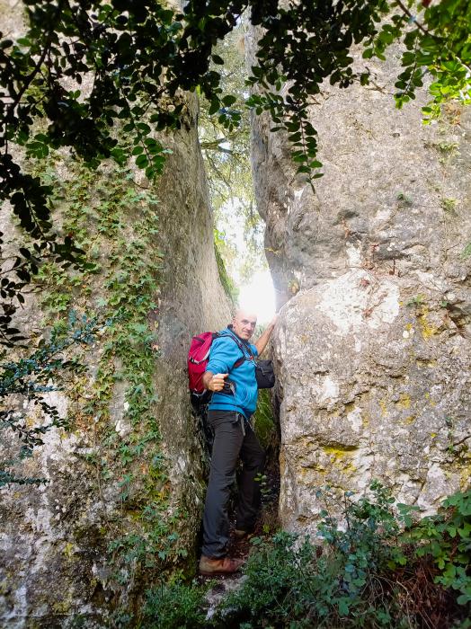 Llegamos a un estrecho pasadizo entre moles rocosas, nos acercamos al “callejón de las trampas”, pero antes de avanzar poe este paraje, buscamos una estrecha rendija en una pared junto al camino que tenemos que atravesar para buscar el yacimiento arqueológico.